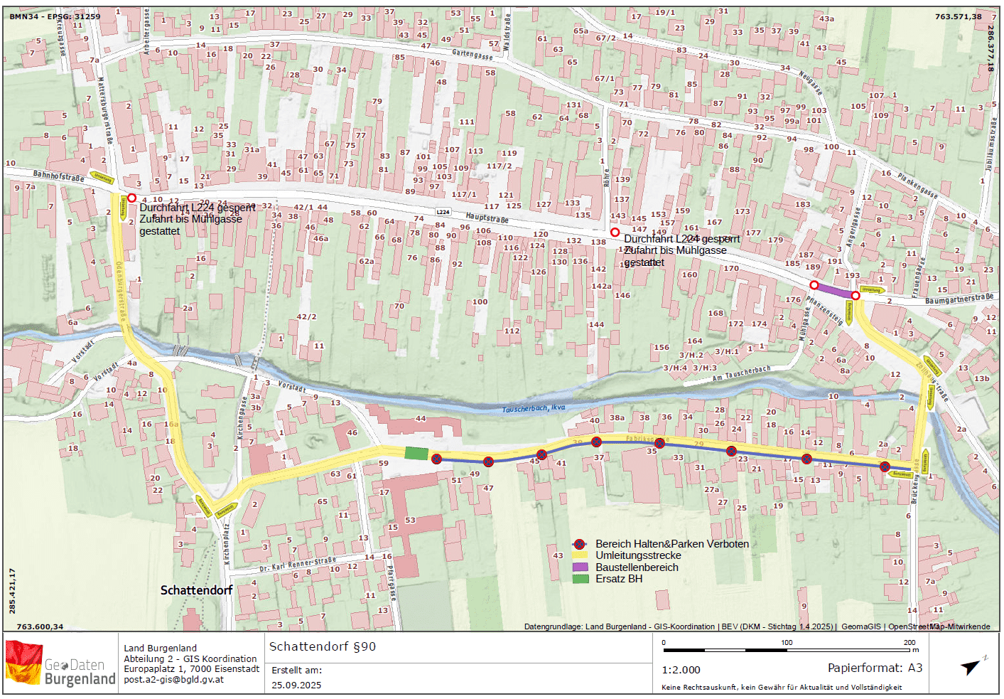 Vorraussichtliche Totalsperre in der Hauptstraße im Bereich zwischen Mühlgasse und Angerlgasse von Montag, 20.10.2025 bis Dienstag, 04.11.2025. Umleitung über die Fabriksgasse.